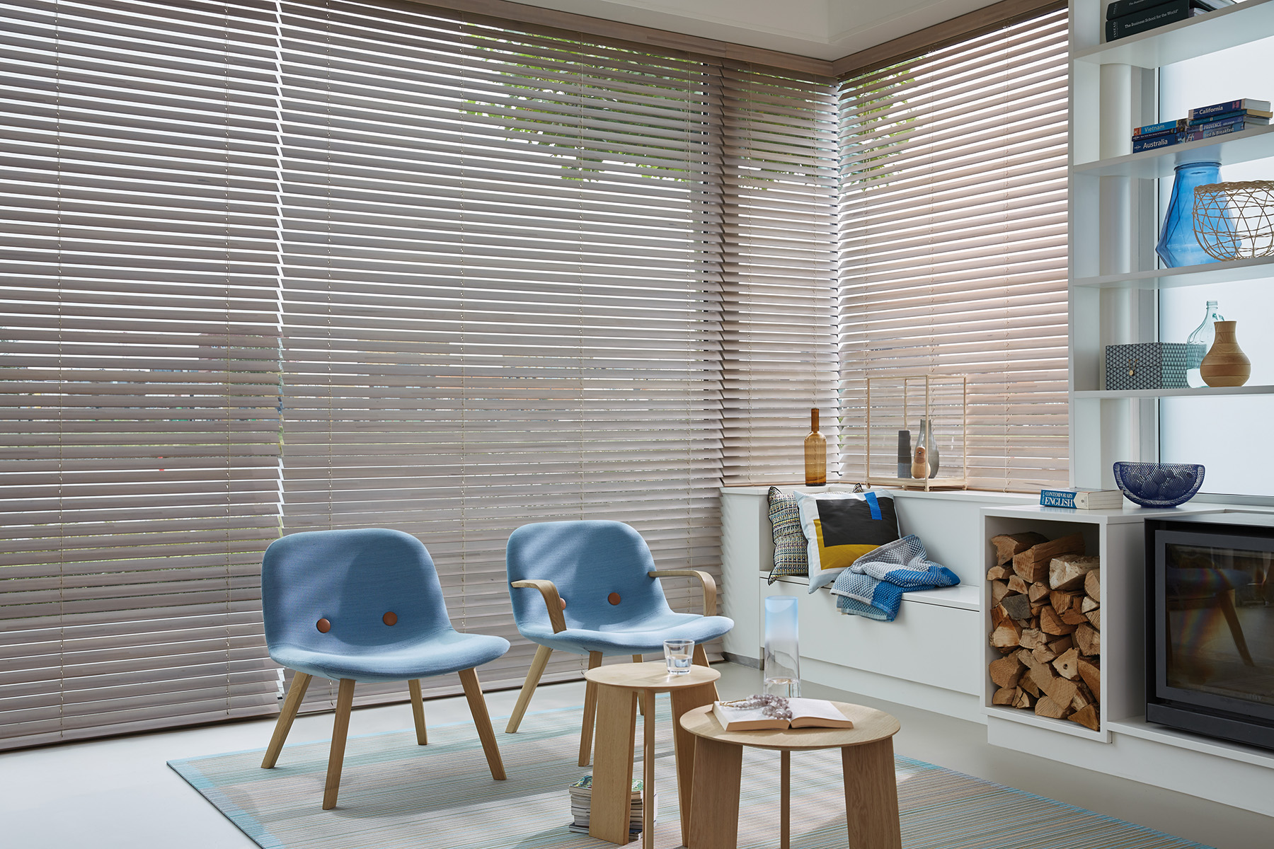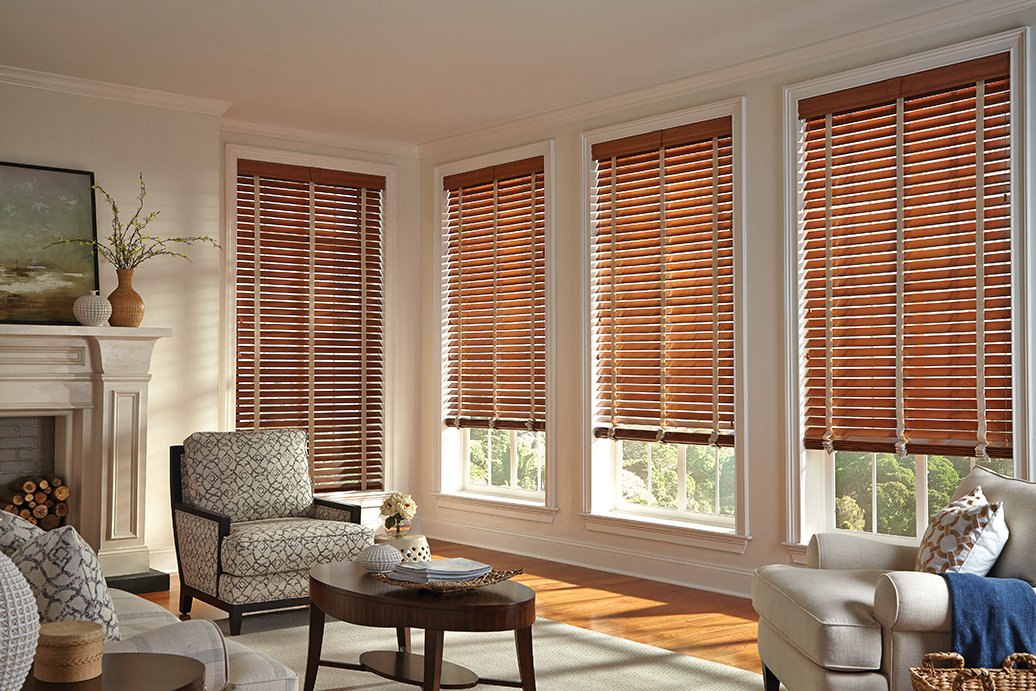 Wooden blinds are generally known as Venetian blinds. A number of horizontal wooden slats are joined together by corded pulleys which can either gather all the slats at the top of the window to reveal the view or simply angle the slats while allowing some light to travel through the blinds yet retaining some level of privacy.